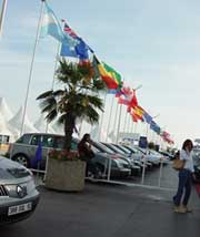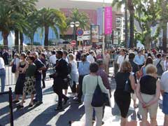午後からは、映画祭に併営されている見本市、マルシェのレジストレーションに向かう。昨年から映画祭のメイン会場となるパレの脇の船着場内のイベント会場が、登録の受付カウンターになっている。去年より混雑している感じ。これは申請を希望している人数が増えたからではなく、映画祭側の対応がただ悪いだけという噂も。