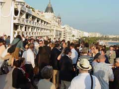 昨日のストの影響は、映画祭全体の活気に大きな影をおとしている。日本のバイヤーの60%が今日の午前の段階でカンヌ入りしていないという状況。多分日本以外の国も同じ状況だから、当然マーケット会場は例年になく異様な静けさ。もうひとつ、SARSの発症地域からの参加者は、10日以上の試験期間を経て発症が認められないとの承認がなければ、映画祭に参加できないという厳しいお達しが発表された。もちろん、香港や中国からの参加者はセラーもバイヤーも10日前からヨーロッパ入りするなどして、その条件をクリアーしなければならず、このことを理由に参加を見合わせた会社もあったようだ。